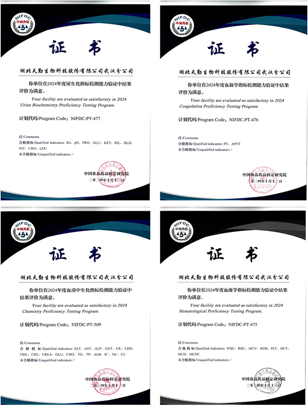 在血清中生化指標(NIFDC-PT-509)、血液學指標(NIFDC-PT-475)、血凝學指標(NIFDC-PT-476)和尿生化指標(NIFDC-PT-477)四個關(guān)鍵項目的能力驗證過程中,天勤生物武漢分公司提交了全部37個能力驗證指標,且所有項目均以滿分100分通過,最終獲得“滿意”的最高等級認定。在臨床檢驗領(lǐng)域,天勤生物武漢公司不僅配備了先進的儀器設(shè)備,還建立了完善的實驗室質(zhì)量控制體系,并擁有一支高技能的專業(yè)團隊,這一系列優(yōu)異的成績充分展示了天勤生物武漢分公司在臨床檢驗領(lǐng)域的扎實功底。