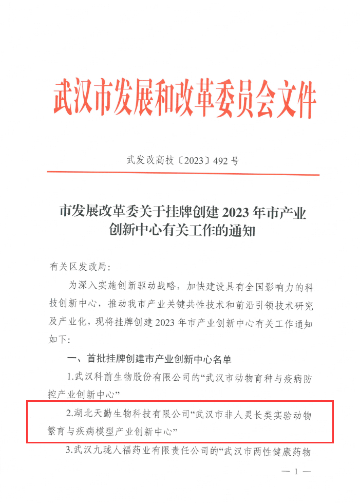 天勤生物“武漢市非人靈長(zhǎng)類實(shí)驗(yàn)動(dòng)物繁育與疾病模型產(chǎn)業(yè)創(chuàng)新中心”成功獲批