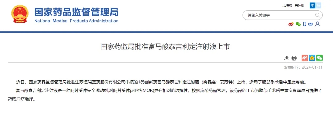 2024年1月31日,中國(guó)國(guó)家藥品監(jiān)督管理局(NMPA)官網(wǎng)宣布批準(zhǔn)恒瑞醫(yī)藥1類創(chuàng)新藥“富馬酸泰吉利定注射液”(商品名:艾蘇特)上市,適應(yīng)癥為腹部手術(shù)后中重度疼痛。 湖北天勤生物科技股份有限公司(以下簡(jiǎn)稱“天勤生物”)表示熱烈祝賀。天勤生物子公司湖北天勤鑫圣生物科技有限公司(以下簡(jiǎn)稱“天勤鑫圣”)作為“富馬酸泰吉利定注射液”項(xiàng)目的合作伙伴,與恒瑞醫(yī)藥緊密配合,在3.5個(gè)月內(nèi)完成了該品種關(guān)鍵代謝產(chǎn)物的重復(fù)給藥毒性試驗(yàn)、生殖二段試驗(yàn)和遺傳毒性試驗(yàn)研究,為“富馬酸泰吉利定注射液”新藥的獲批上市提供了有力支持。 “富馬酸泰吉利定注射液”是一種阿片受體完全激動(dòng)劑,對(duì)阿片受體μ亞型(MOR)具有相對(duì)的選擇性,按照麻醉藥品管理。研究數(shù)據(jù)顯示,該藥物不僅鎮(zhèn)痛效果顯著,起效速度快,能有效延緩術(shù)后疼痛反彈需補(bǔ)充鎮(zhèn)痛的時(shí)間;并且在保證鎮(zhèn)痛效果的同時(shí),大幅降低了惡心、嘔吐和呼吸抑制等常見不良反應(yīng)的發(fā)生率,極大地提升了患者的治療舒適度和安全性。 天勤生物祝賀“富馬酸泰吉利定注射液”順利獲批上市,該藥品的上市為腹部手術(shù)后中重度疼痛患者提供了新的治療選擇。同時(shí),天勤生物將不斷探索和...